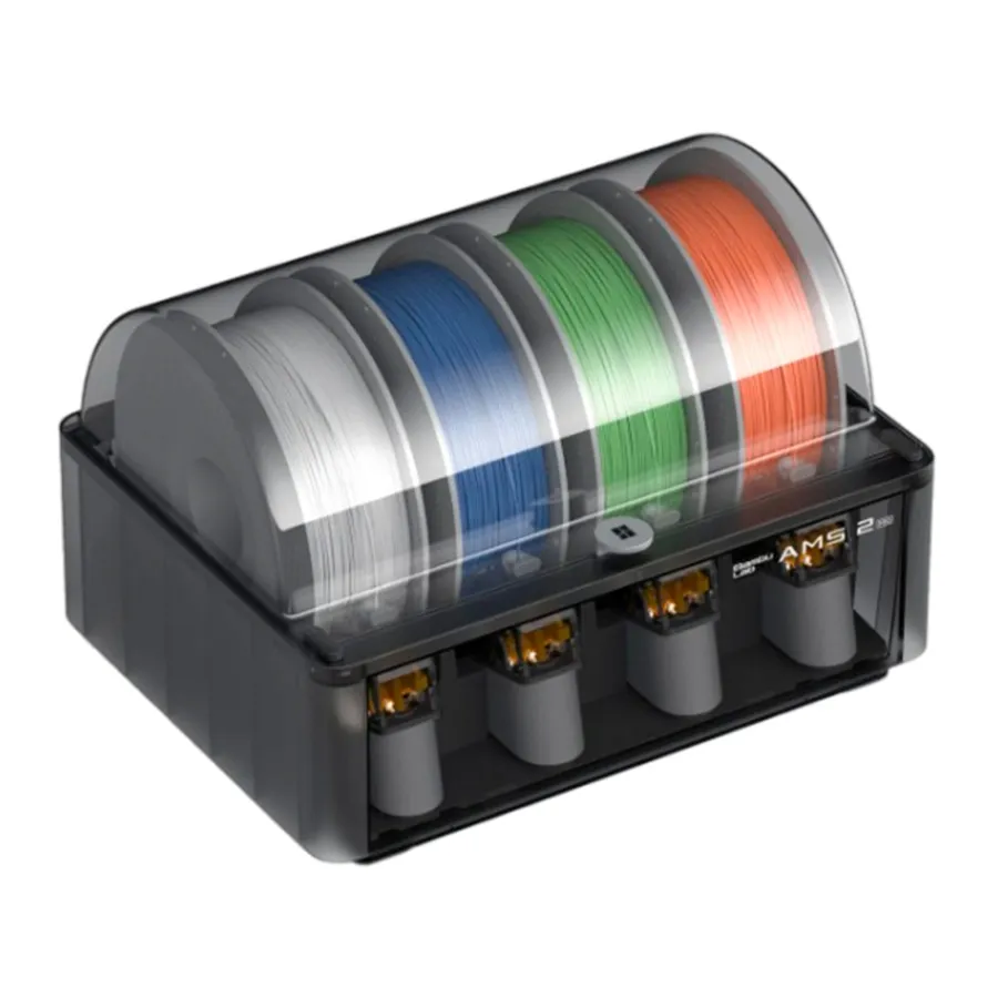 AMS Bambu Lab 2 Pro обладает герметичным корпусом, в котором находятся датчики влажности для поддержания сухости нитей. Это позволяет использовать гигроскопичные материалы, такие как нейлон и поликарбонат. Каждая AMS Bambu Lab 2 Pro имеет 4 слота для нитей, что позволяет устанавливать до 4 филаментов одновременно. Благодаря наличию нескольких слотов, можно использовать различные материалы для создания поддержек или растворимый пластик для опор. Системы AMS 2 Pro можно объединять до 4 штук для использования до 24 цветов.