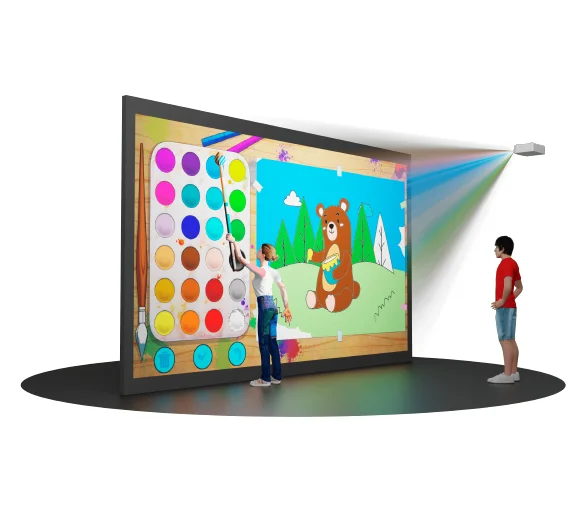 Интерактивная стена «Мастер-фломастер» превращает обычную поверхность в творческое пространство с яркой анимацией и красочной графикой. Дети могут раскрашивать картинки с помощью специальных кистей, оживляя изображения и погружаясь в процесс игры и обучения. Система сочетает в себе развлекательные и развивающие элементы, помогая раскрыть творческий потенциал ребёнка.