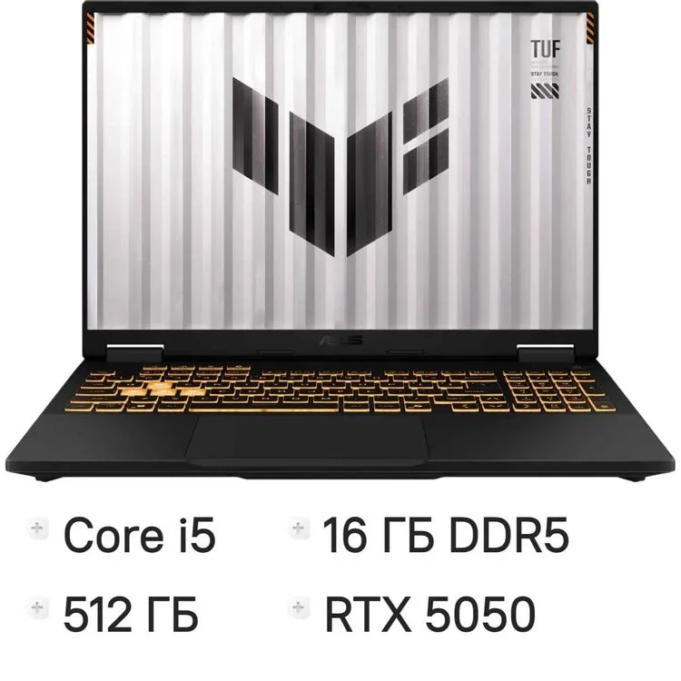 ASUS TUF Gaming F16 FX608JHR-RV142 16", 2025, IPS, Intel Core i5 14450HX 2.4ГГц, 10-ядерный, 16ГБ DDR5, 512ГБ SSD, NVIDIA GeForce RTX 5050 для ноутбуков - 8 ГБ, без операционной системы, серый [90nr0na1-m007k0]