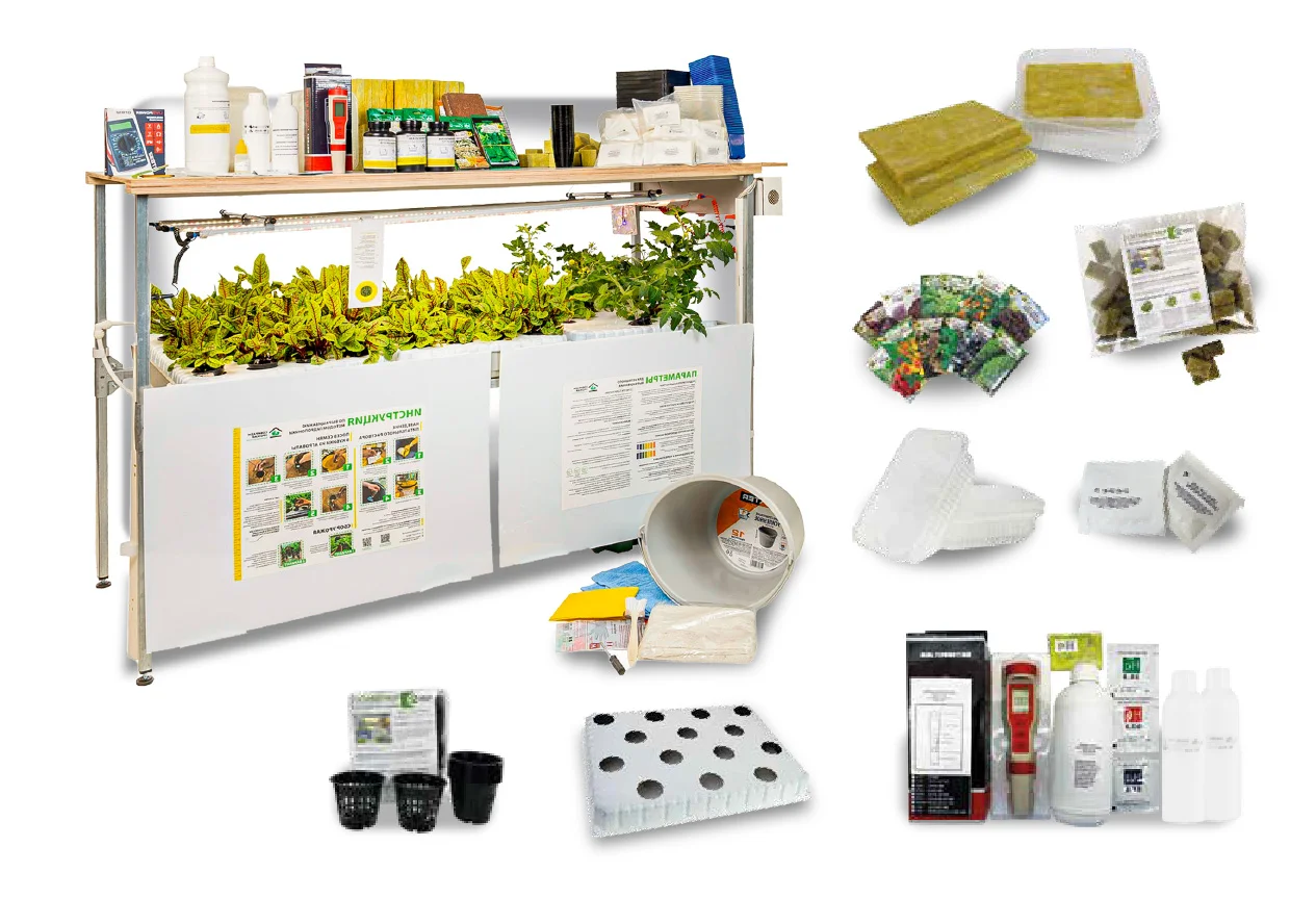 | Расходные материалы | Семена (50+ видов), удобрения A+B+C, pH-корректоры, емкости |