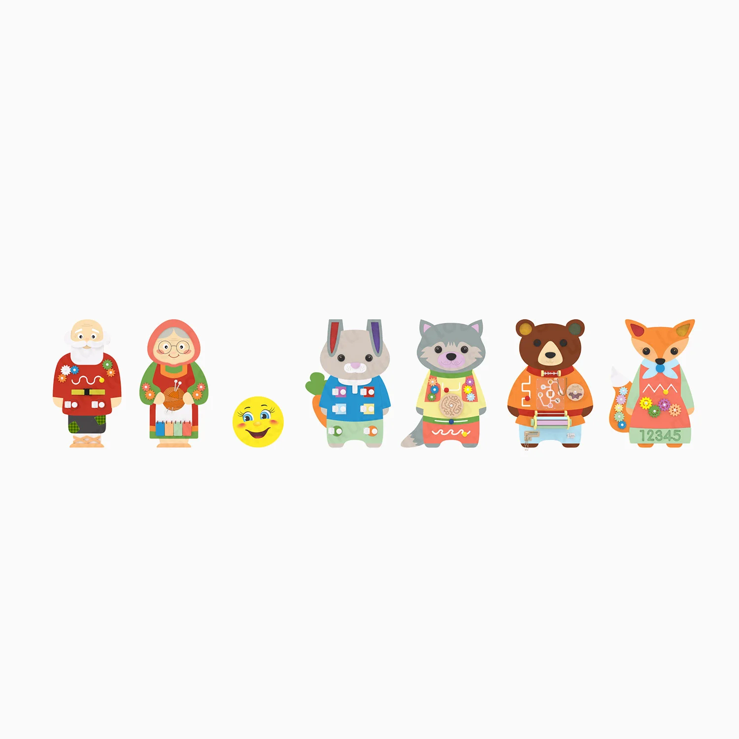 - Состав набора: 7 бизибордов — герои и объекты сказки «Колобок»