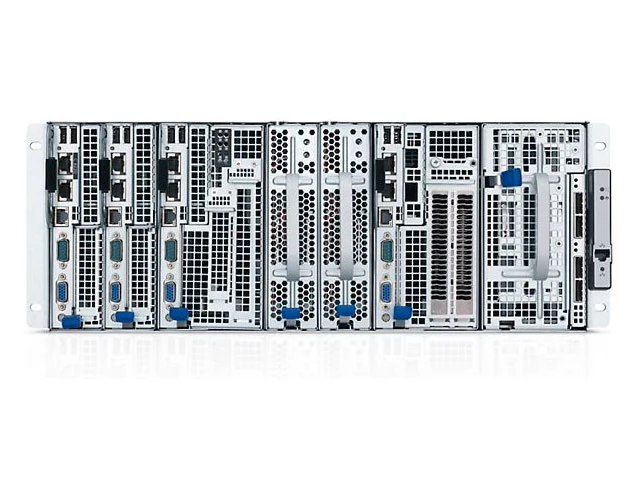 - Форм-фактор шасси 4U с возможностью установки до 8 салазок одинарной ширины или до 4 салазок двойной ширины.