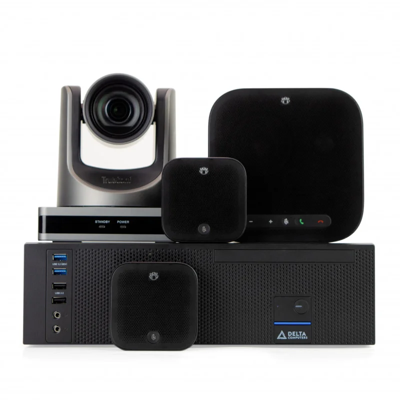 - Высокое качество изображения и звука благодаря комплектной PTZ-камере и спикерфону